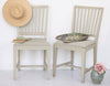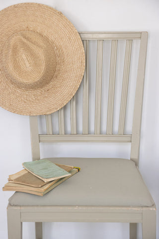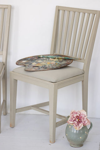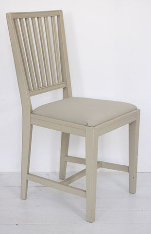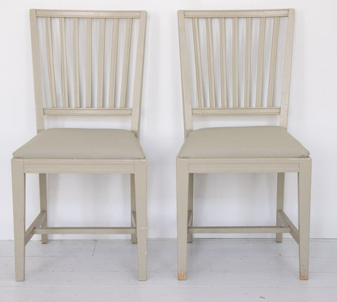 Skønne gamle svenske stole i den fineste grå/grønne gustavianske farve. Stolene har riller i ryggen og er i god stand. Man kan nemt skifte stoffet på sædet hvis man ønsker.